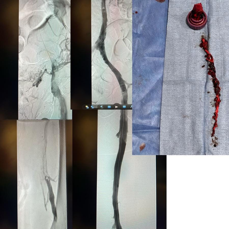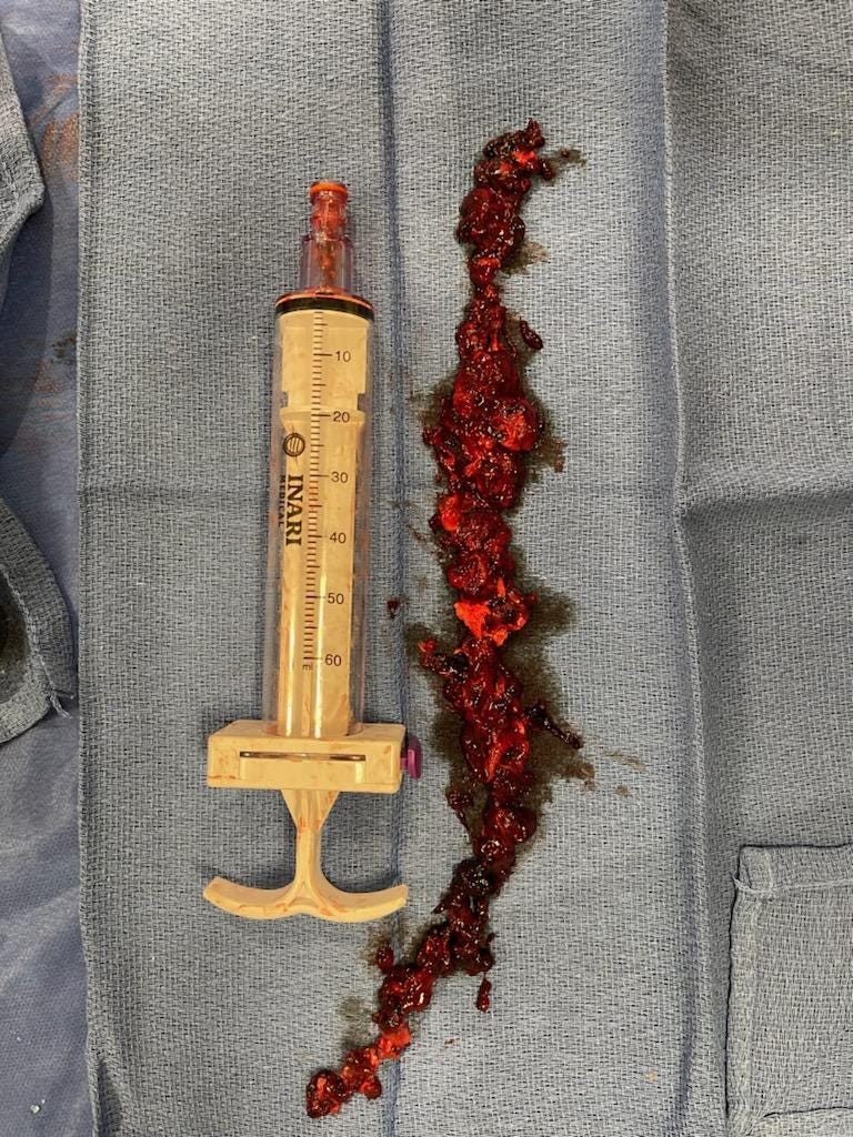 You will notice the grape jelly-like clots in the above video along with clumps of the white fibrous clots. What’s most troubling about this is that Richard texted me the Twitter/X link immediately after he posted it and I was unable to view it. I received the message, “page doesn’t exist”. When I sent the link to my friend who has an account, she was able to view it. One might think that Twitter/X just wants to incentivize people to sign up for an account. If that is the case, then why am I able to view other posts from Richard that don’t contain videos? My first Substack post, included a video of Richard pulling a clot out of a jugular vein. Richard posted that video on February 18, 2024 on Twitter/X. It was viewed 20 million times in just 48 hours before it was shadow-banned (without a Twitter/X account, you are unable to view it). My guess is that now Richard is shadow-banned if he posts a video.